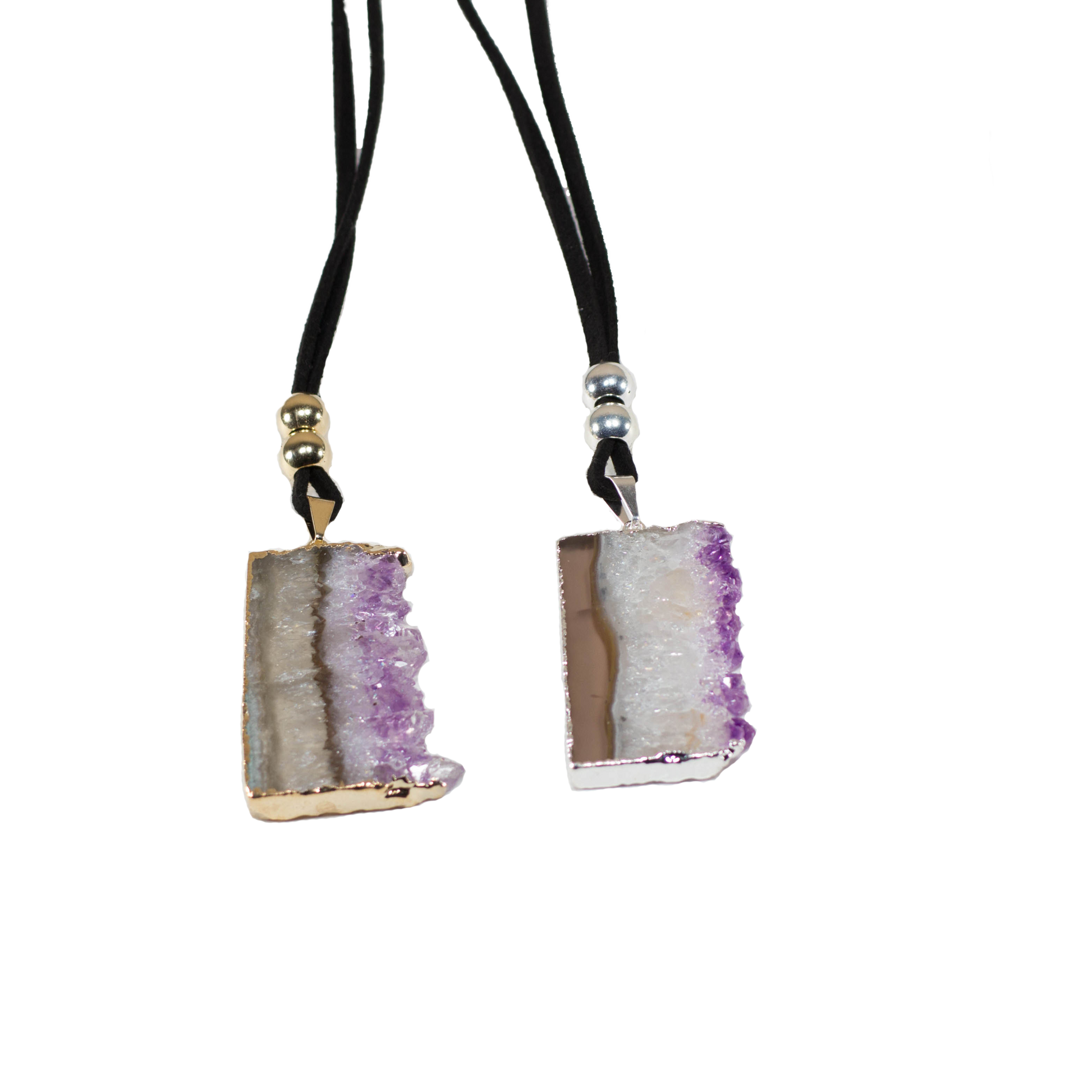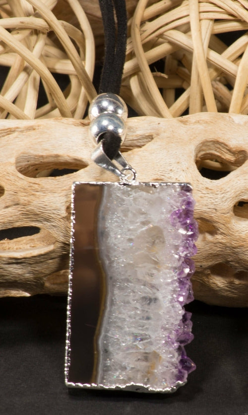 Enhance your style with the Amethyst Vertical Slice on a Leather Necklace, a beautiful accessory that combines natural elegance with everyday wearability. This leather necklace features a delicate sliver of amethyst, adorned with either silver or gold trim, showcasing the stunning hues and unique patterns of this cherished gemstone.