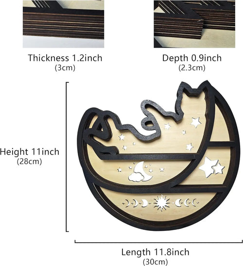 Add a whimsical touch to your space with the Moon & Cat Display Shelf, a Bohemian-inspired shelf designed for crystal enthusiasts. With its enchanting moon shape and playful cat motif, this shelf is both a functional organizer and a charming piece of wall decor.