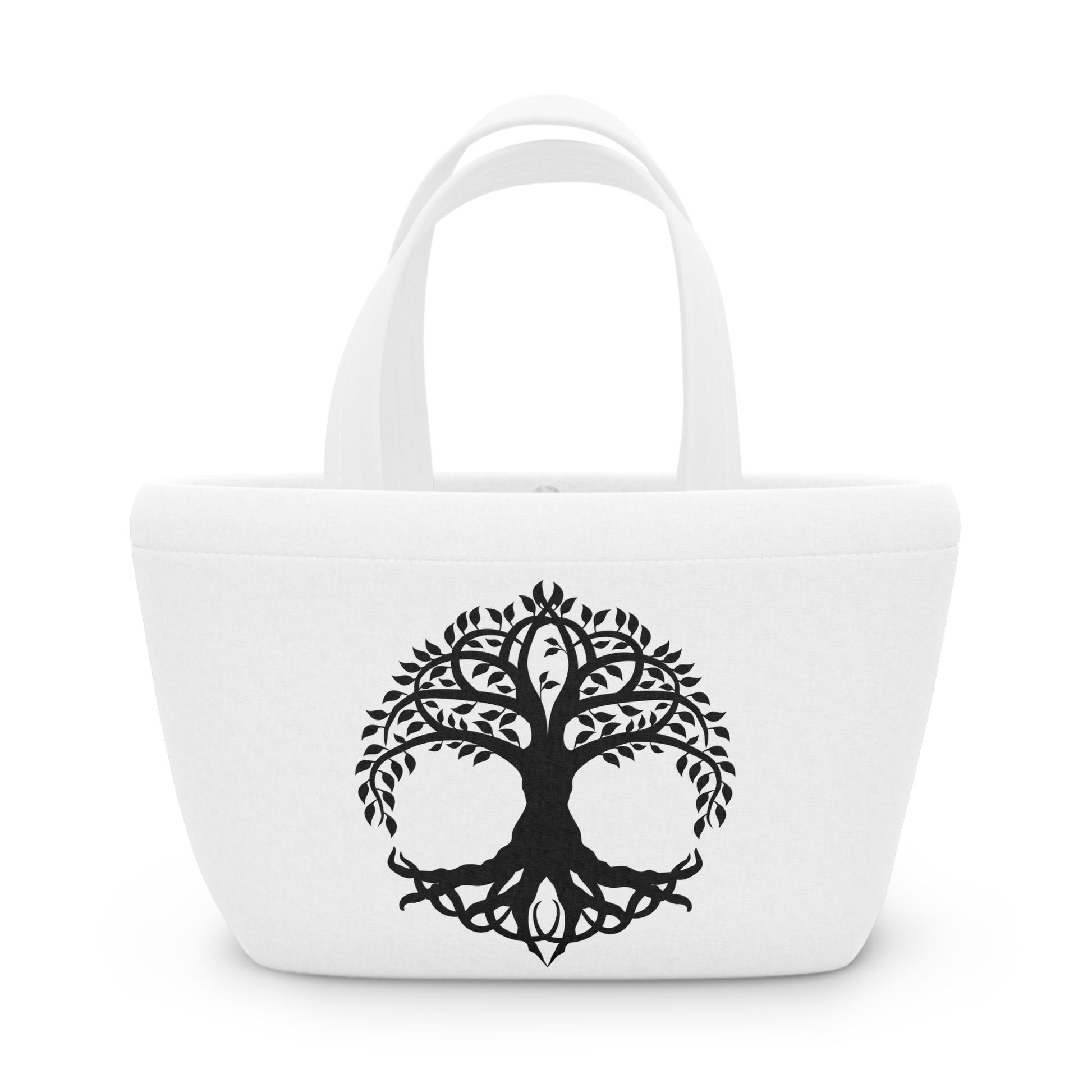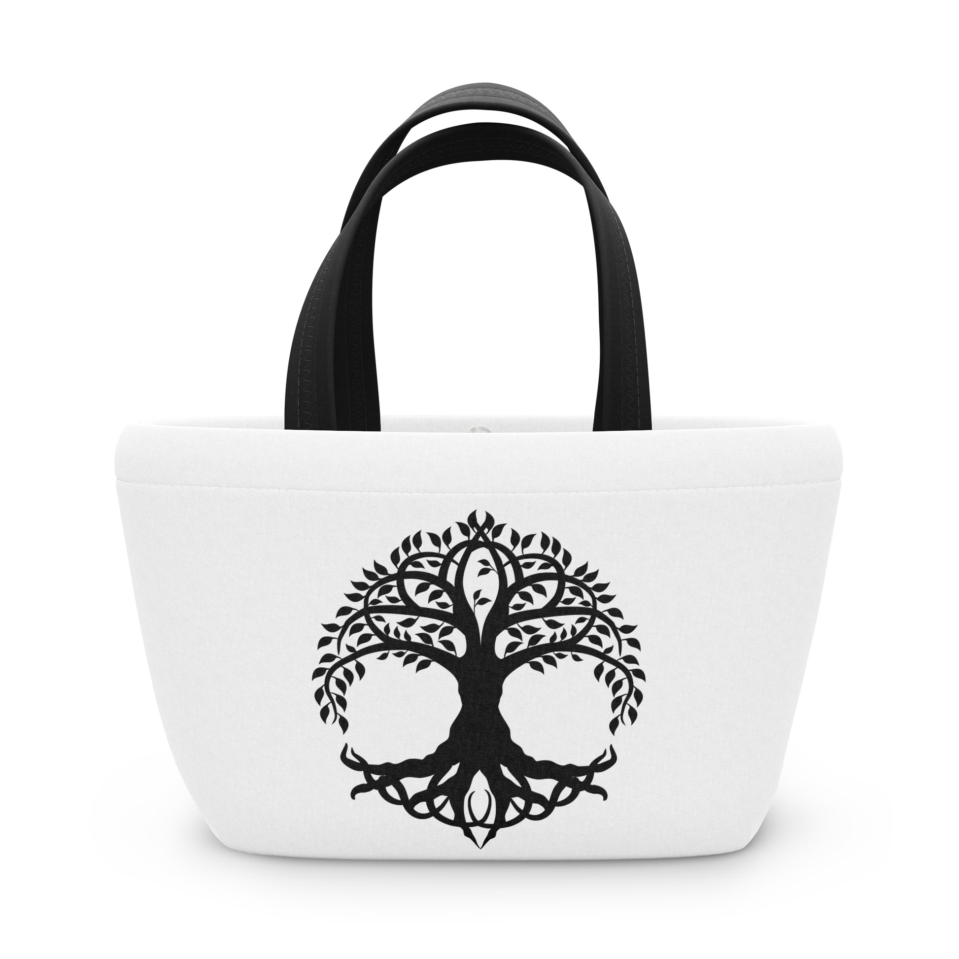 Crafted from soft yet sturdy 100% neoprene (95% polyester, 5% spandex), this bohemian lunch bag boasts a spacious interior and a curved silhouette with a flat bottom that helps maintain the shape and keeps your food balanced and secure. The clean white background highlights the detailed Celtic tree artwork, complemented by your choice of black or white handles for personalized style.