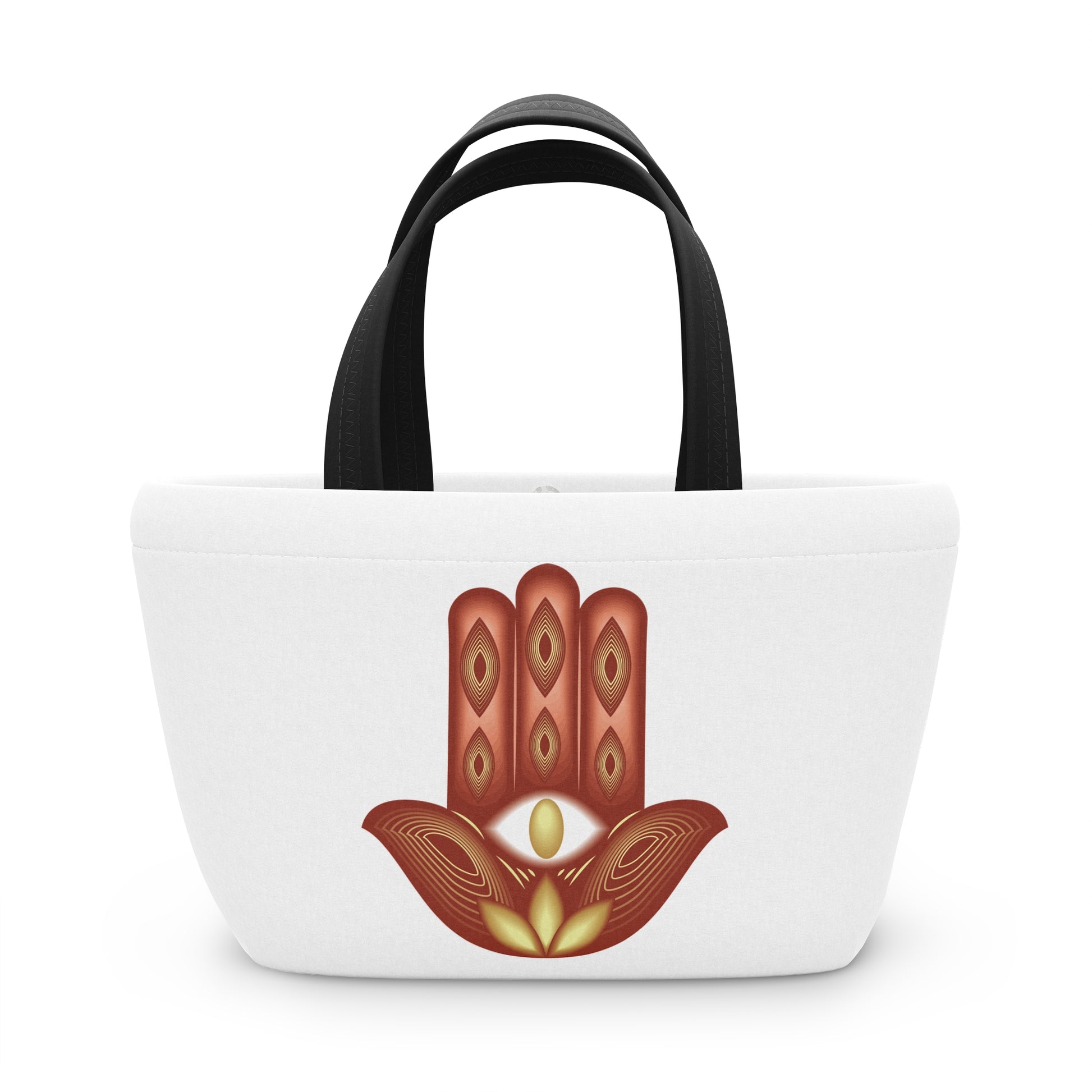Crafted from 100% neoprene (95% polyester, 5% spandex), this bohemian lunch bag balances softness and durability with a roomy main compartment to hold your meals securely. The crisp white base beautifully highlights the detailed, colorful Hamsa lotus artwork, complemented by your choice of black or white double handles for comfortable carrying.