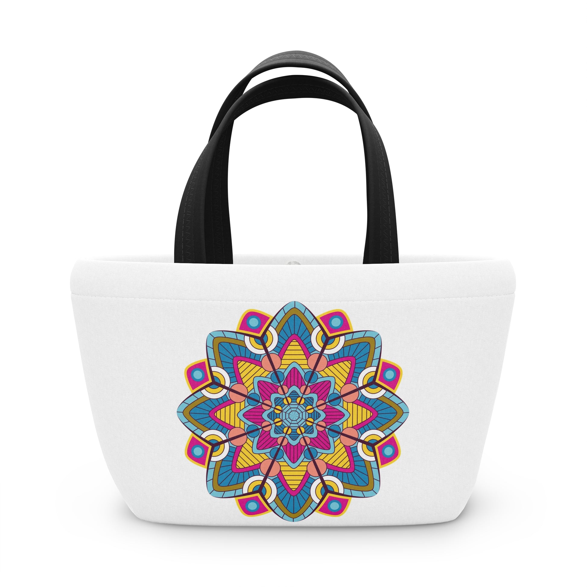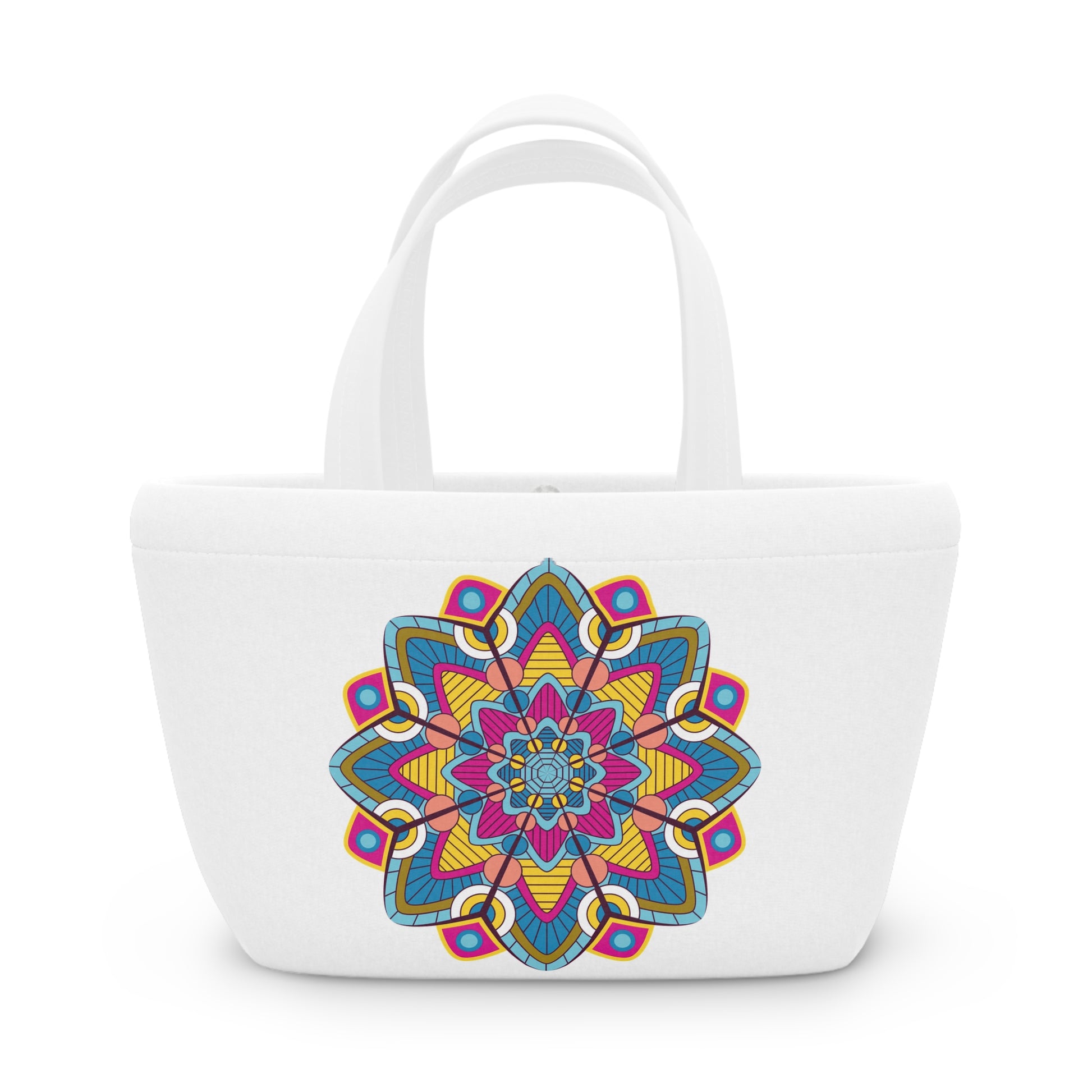 Made from 100% neoprene (95% polyester, 5% spandex), this bohemian lunch bag combines softness with durability, providing a spacious interior to hold your meals safely. The crisp white base makes the bright, intricate mandala artwork pop, while black or white double handles offer comfortable, stylish carrying options.