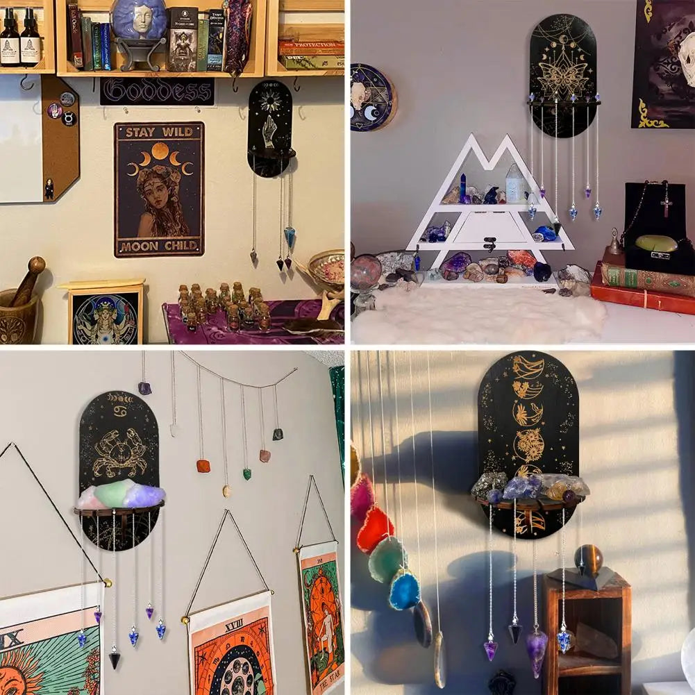 Enhance your home decor with this Crystal Display Shelf, combining bohemian style with practicality to organize your crystals, candles, and jewelry while adding a creative flair to any space.