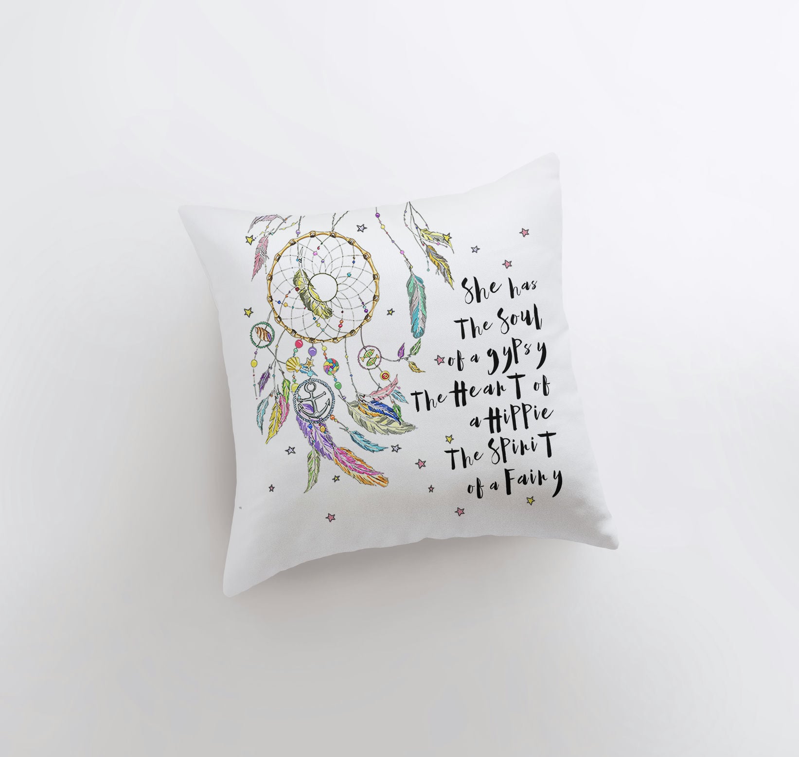 Embrace your free-spirited side with this Bohemian Dream Catcher Pillow the perfect boho accent for any space. Handcrafted with love in the USA, this pillow features a stunning dream catcher design paired with the empowering quote, "She has the Soul of a Gypsy, the Heart of a Hippie, the Spirit of a Fairy." Whether you're decorating your living room, bedroom, or creating a cozy nook, this throw pillow adds that effortless boho-chic touch to your home decor.