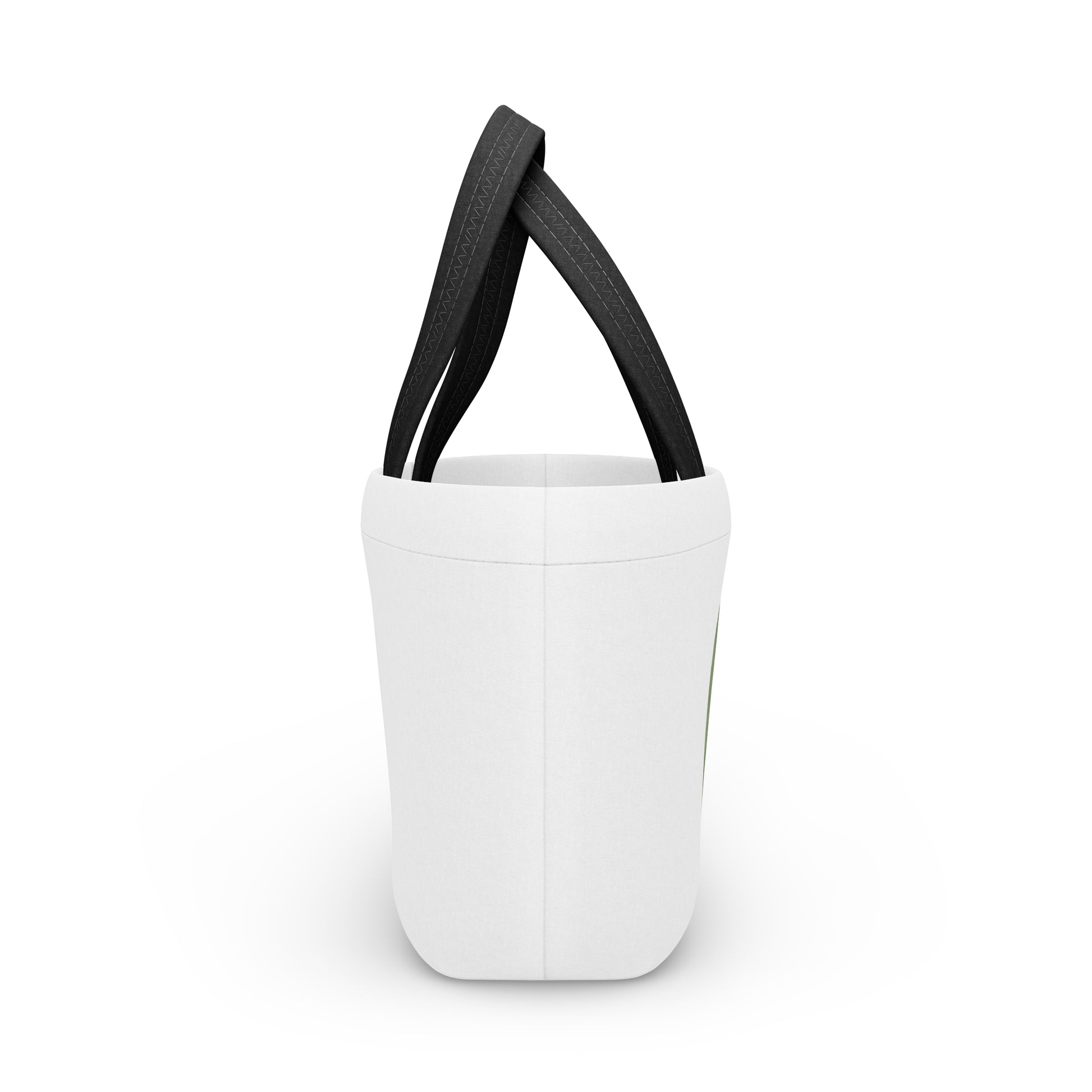 Made from soft yet durable 100% neoprene (95% polyester, 5% spandex), this bohemian lunch bag offers a roomy main compartment and a flat bottom to keep your food safe and upright. The white bag base beautifully contrasts the earthy green tones of the design, while black or white double handles provide stylish comfort.