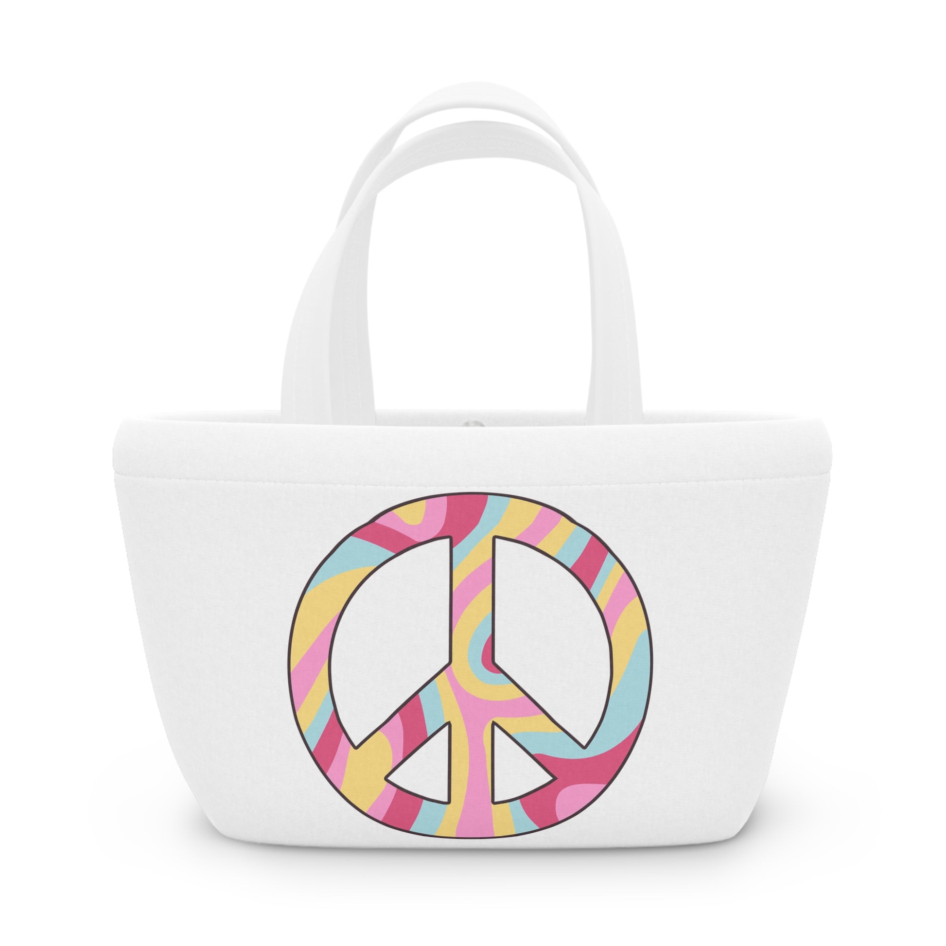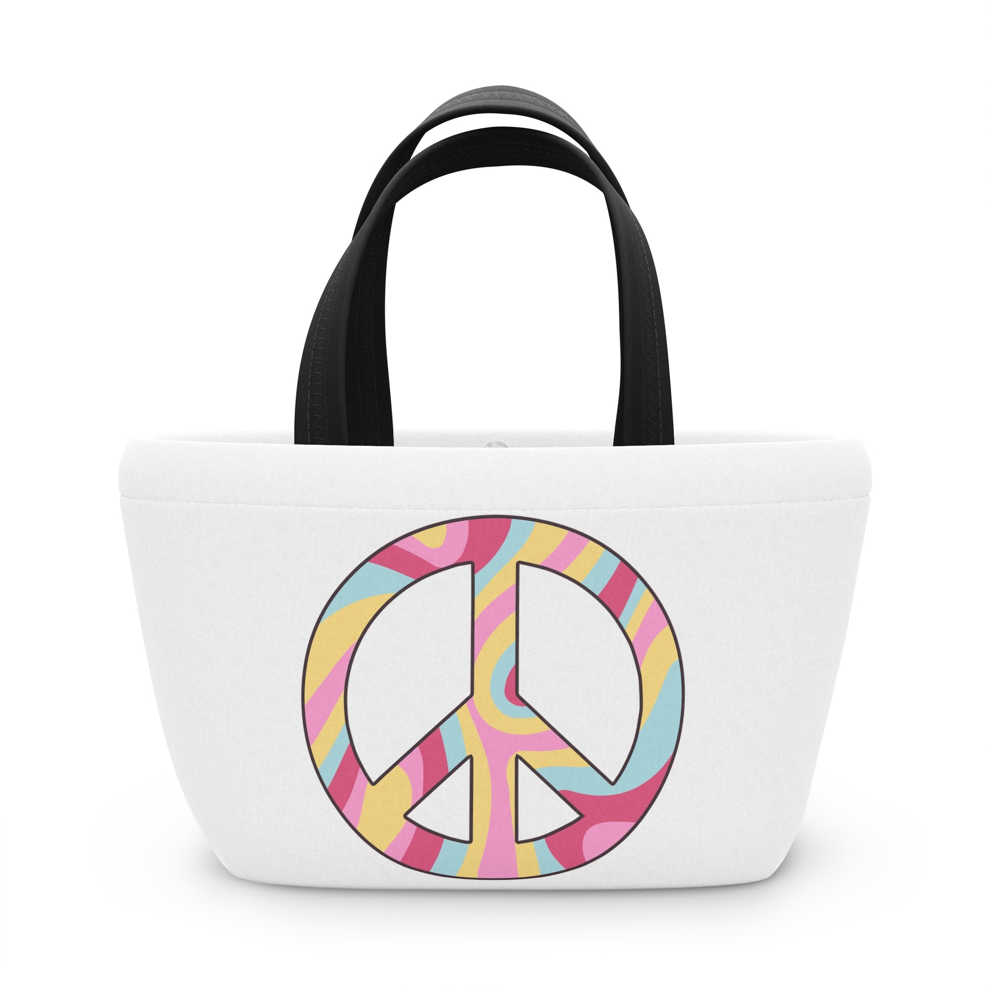 Made from 100% neoprene (95% polyester, 5% spandex), this bohemian lunch bag is soft, durable, and ready to hold your favorite meals or snacks. The vivid hippie peace sign artwork stands out brilliantly against the clean white bag base, while the black or white handle options let you personalize your look.