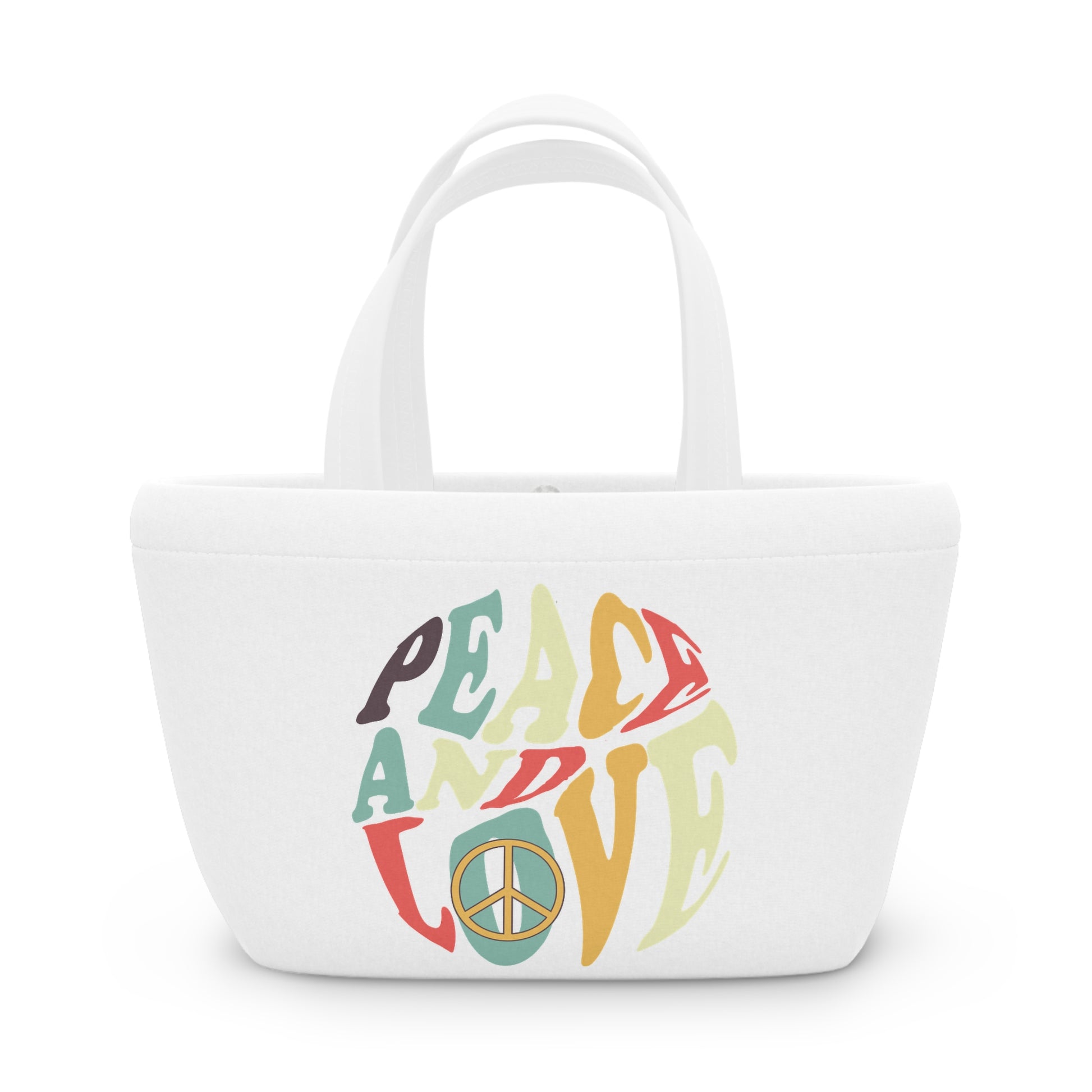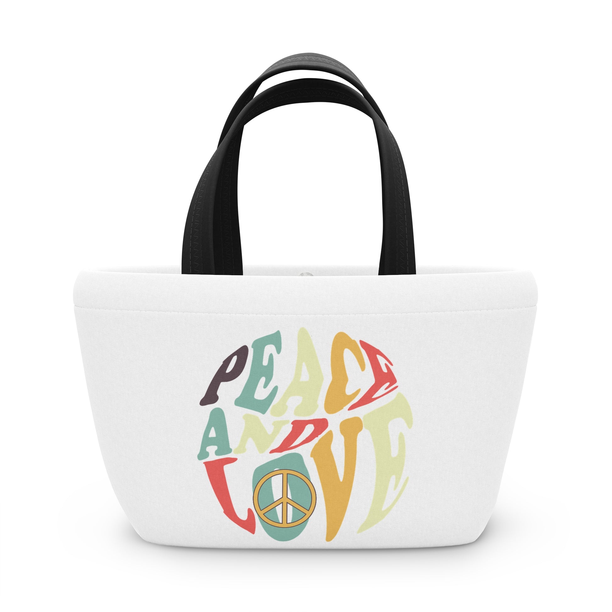 Crafted from 100% neoprene (95% polyester, 5% spandex), this soft and sturdy boho bag offers a spacious interior that keeps your food safe and fresh. The crisp white base highlights the vibrant peace and love text, while your choice of black or white handles adds a personal touch. The curved shape with a flat bottom ensures no squished meals, just stylish practicality.