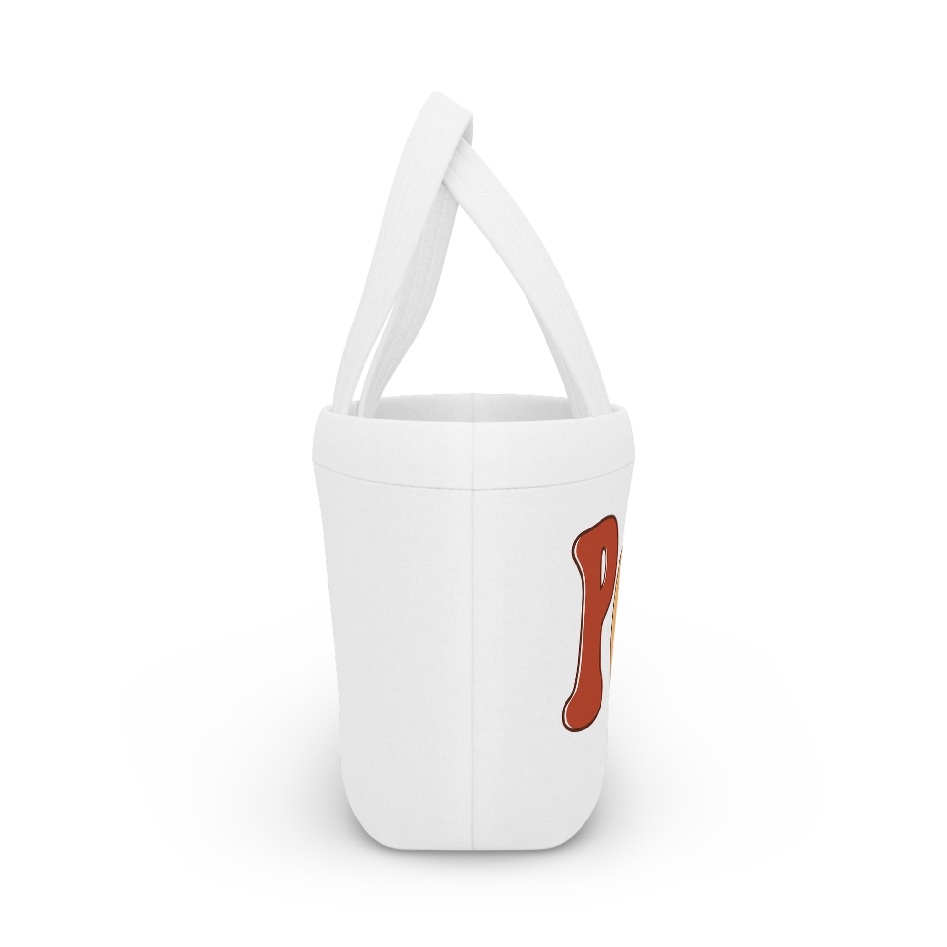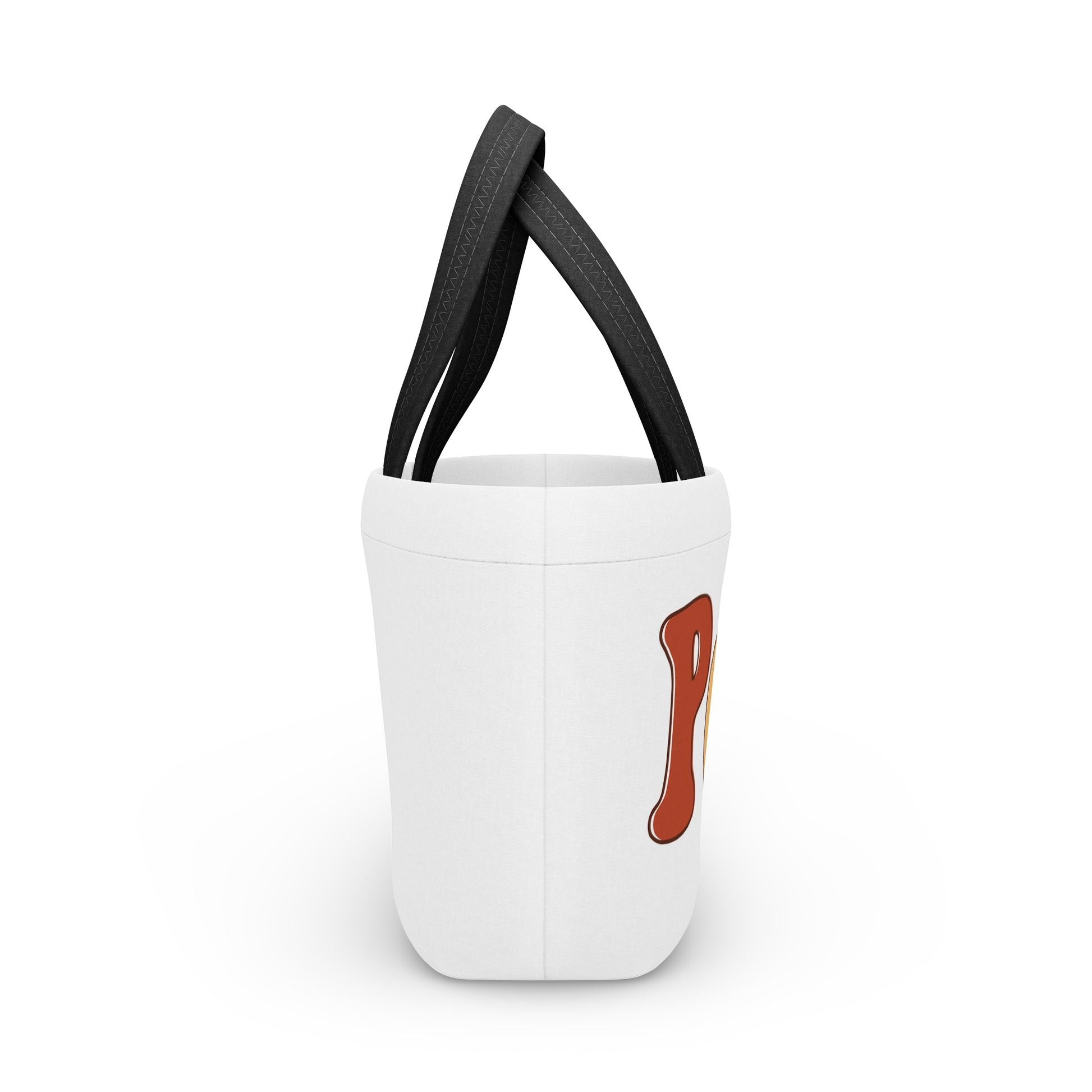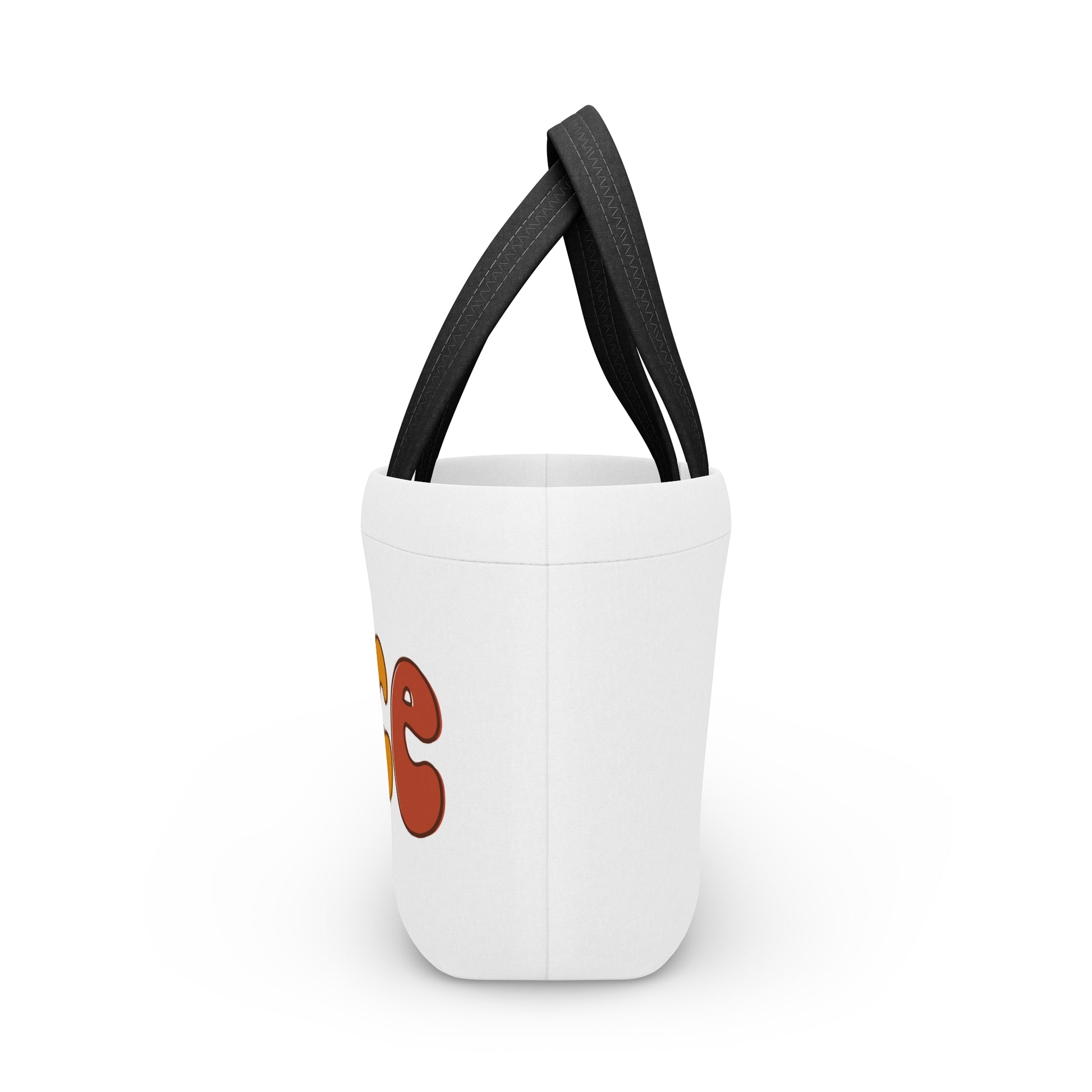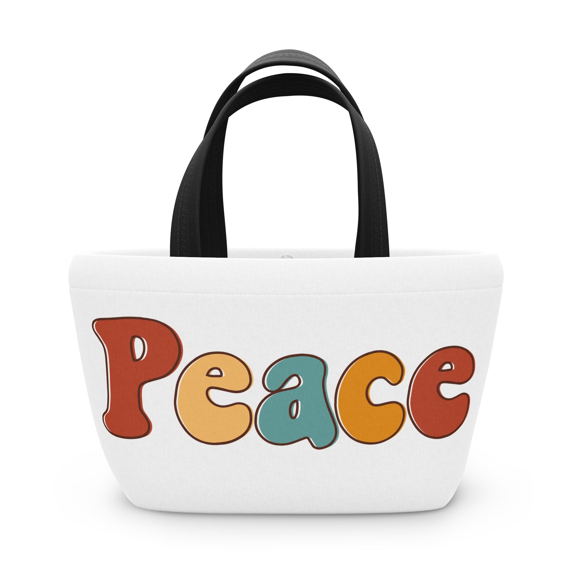Crafted from 100% neoprene (95% polyester, 5% spandex), the Peace Lunch Bag combines soft flexibility with a sturdy, structured base to keep your meals safe and secure. Its spacious main compartment holds your lunch, snacks, and a drink or two, all while staying stylish and functional. The white base makes the vibrant 60s-style "Peace" text pop, and you can choose black or white double handles to match your personal aesthetic.