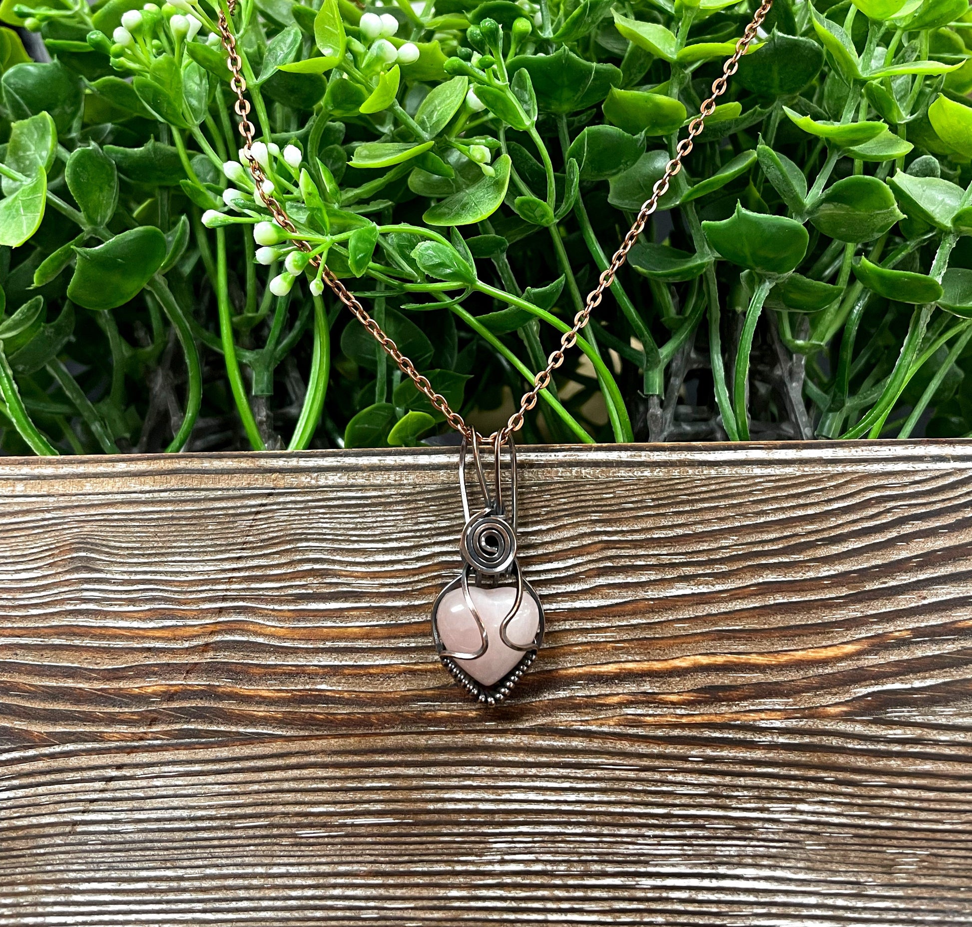 Adorn yourself with our Pink Rose Quartz Wire Wrapped Pendant, beautifully crafted to capture the essence of love and harmony. This charming heart-shaped pendant features a small rose quartz gemstone, delicately wrapped in oxidized copper wire, creating a stunning focal point.