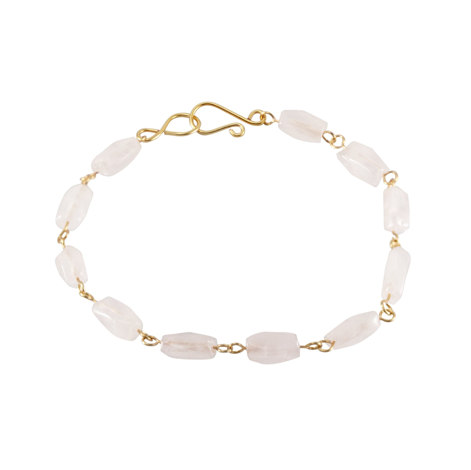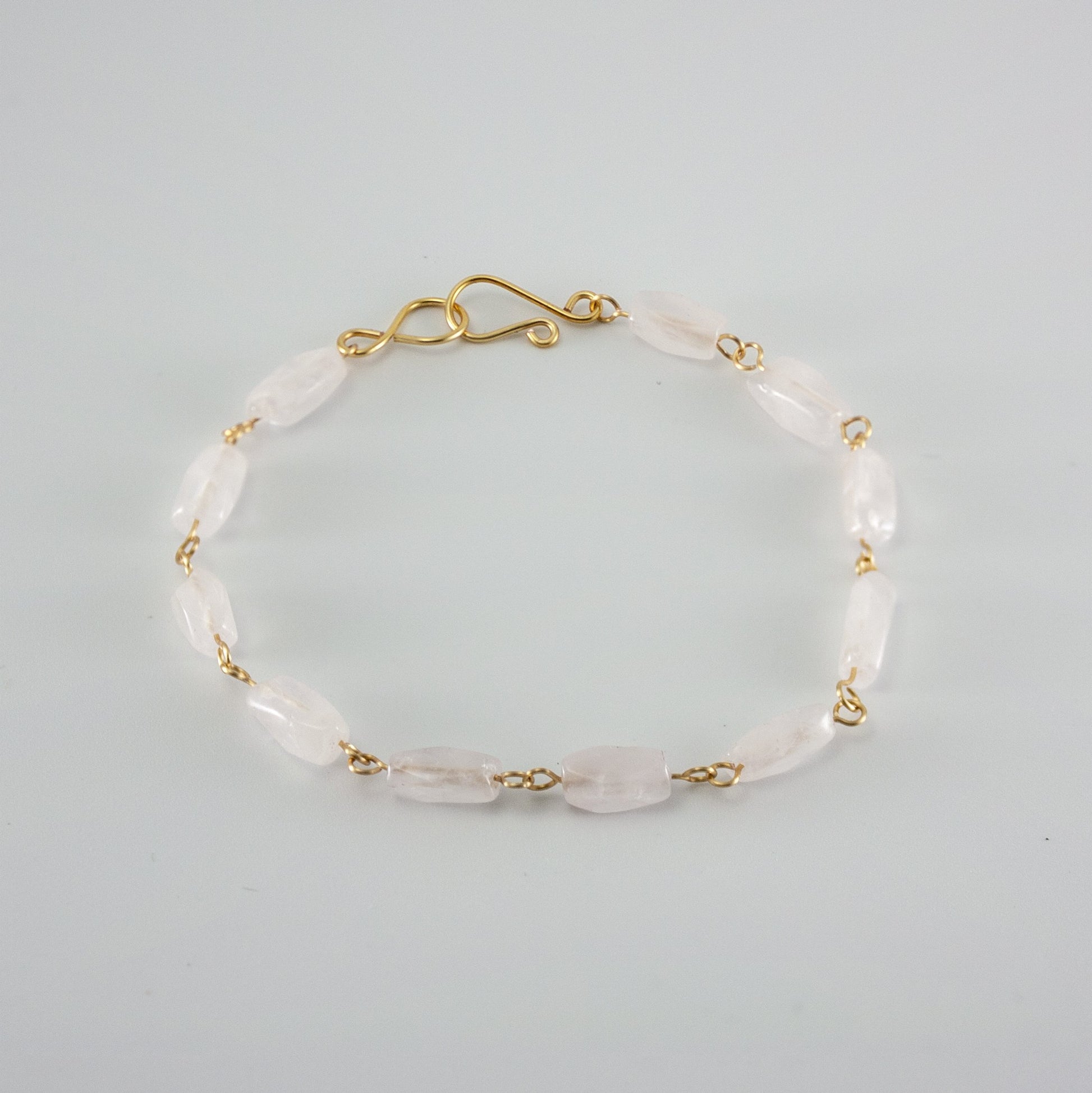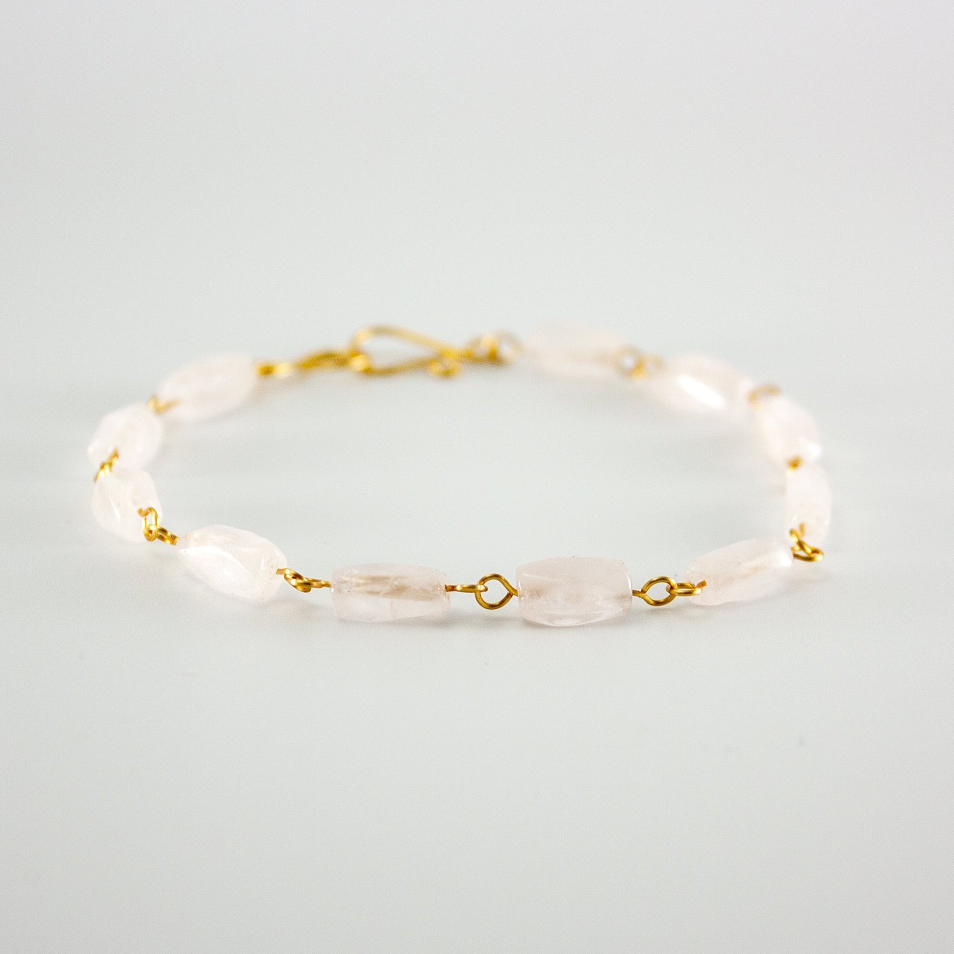 The Rose Quartz Rectangular Gold Link Bracelet showcases the enchanting soft pale pink of rose quartz, creating a charming and sophisticated accessory. Its pastel tone allows for easy pairing with other jewelry and colors, making it a versatile addition to your collection. You'll find yourself wanting to wear this elegant slim bracelet every day.