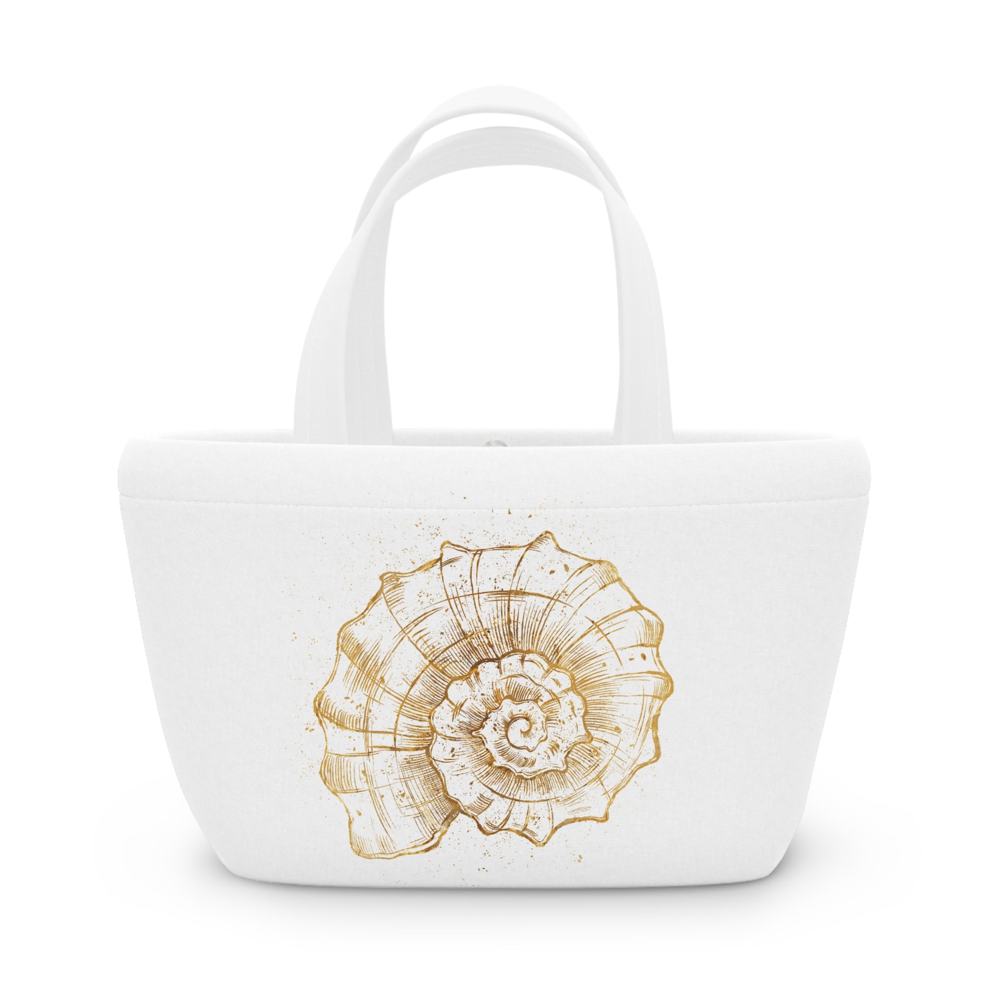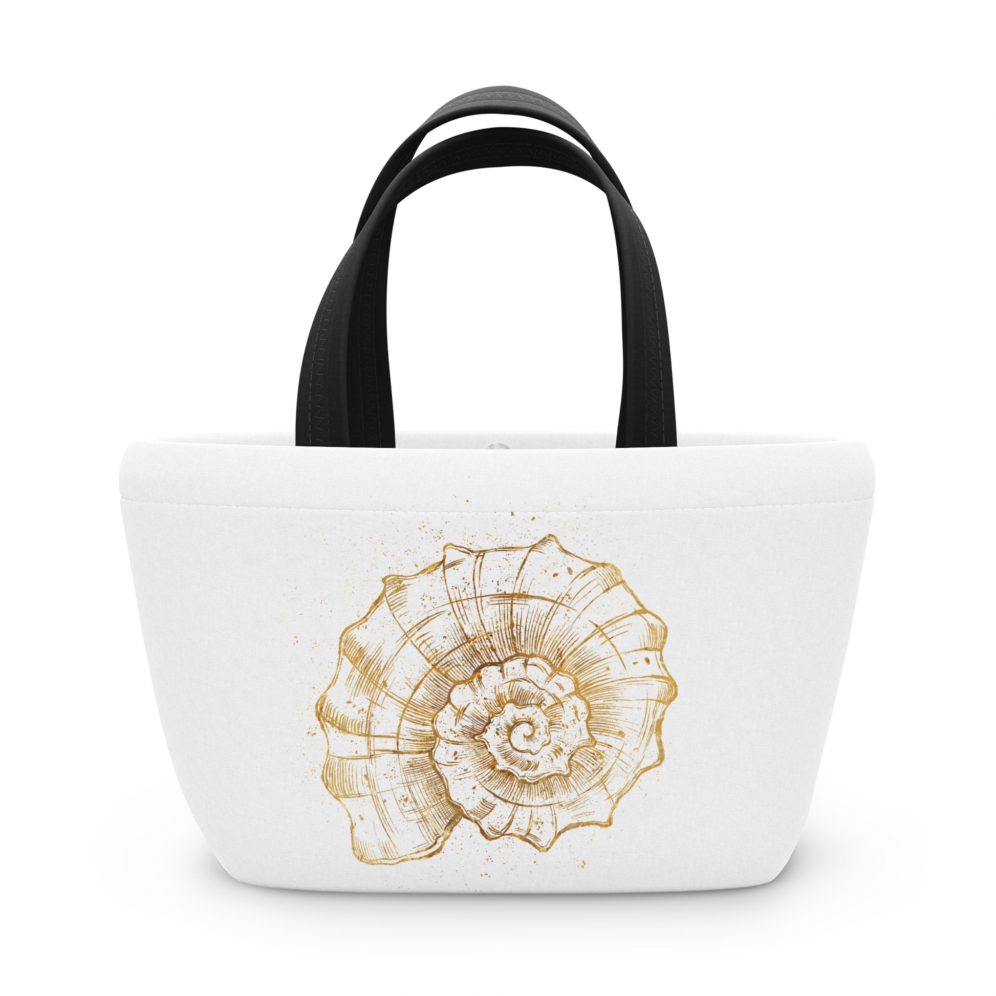 Crafted from 100% neoprene (95% polyester, 5% spandex), this soft yet durable boho lunch bag features a crisp white background that highlights the intricate spiral shell artwork in natural colors. The curved shape and flat bottom keep your meals secure and uncrushed, while the double handles—available in black or white—offer comfortable, stylish carrying options.