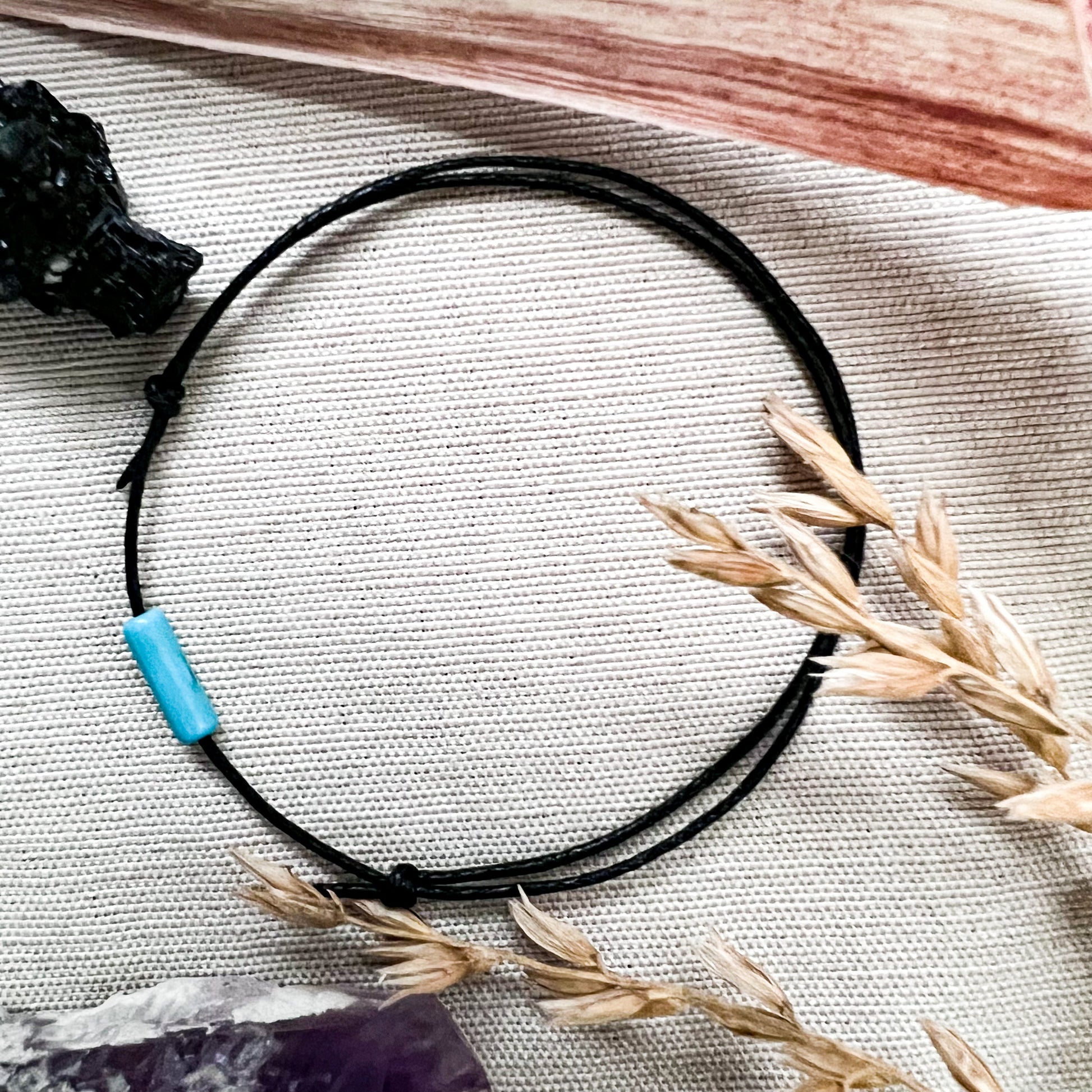 Elevate your everyday style with this Turquoise Bar Bracelet/Anklet, a perfect blend of simplicity and natural beauty. Designed for comfort and versatility, this anklet features a vibrant turquoise stone and a durable waxed cotton cord, making it ideal for daily wear.