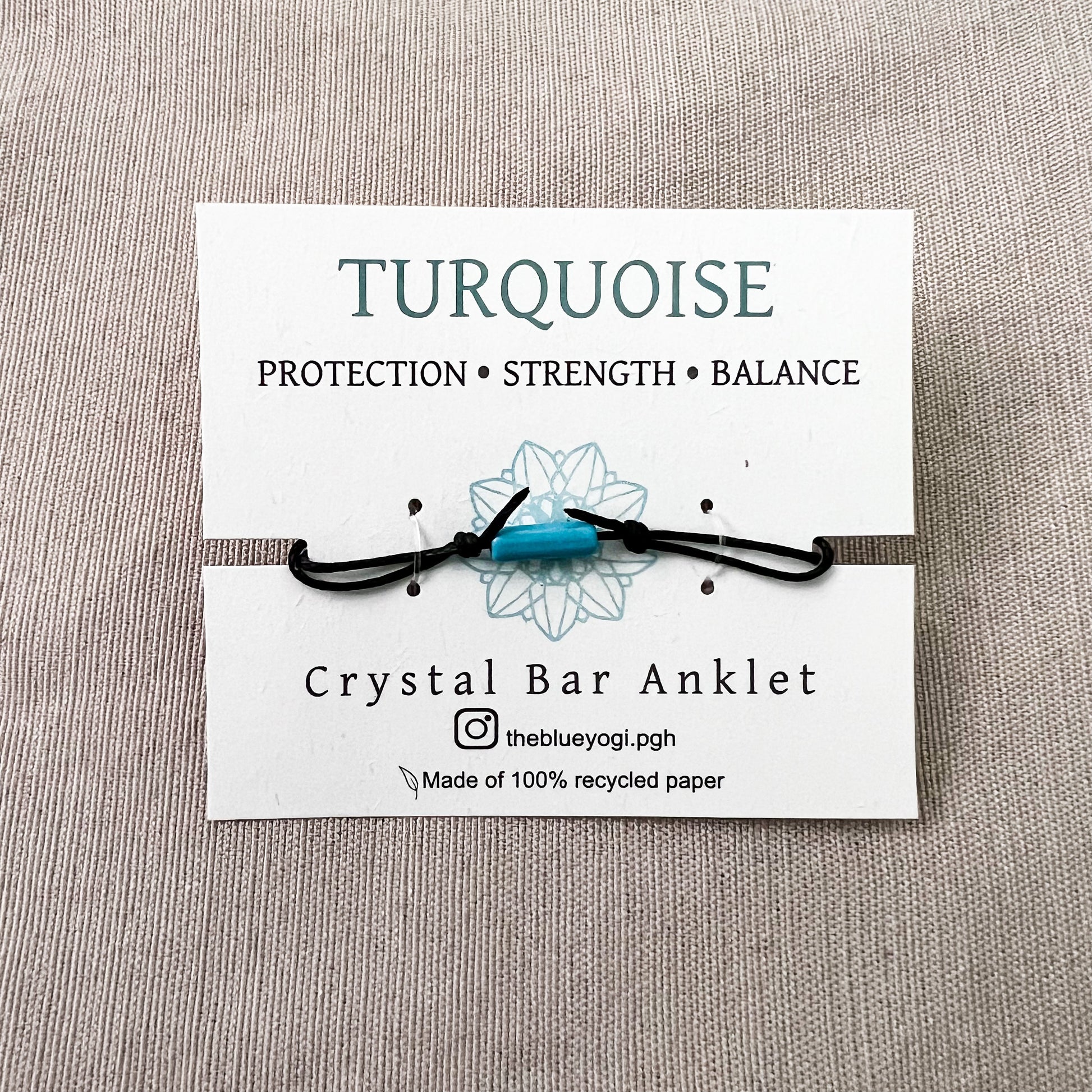 - The anklet showcases a turquoise gemstone bar, known for its wealth as well as calming and protective properties.