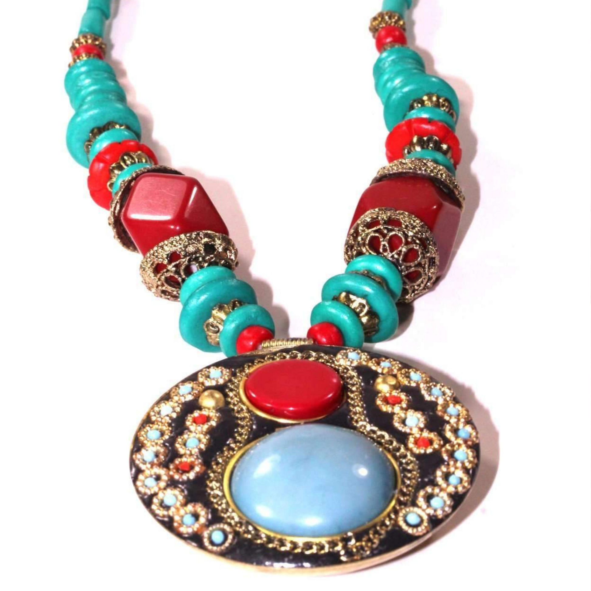 The Turquoise & Red Coral Medallion Necklace is a vibrant accessory that adds a splash of color and charm to any outfit. This stunning piece features a rich resin bead chain in shades of turquoise, deep red coral, and teal, beautifully accented with delicate golden charms. It truly is boho-chic!