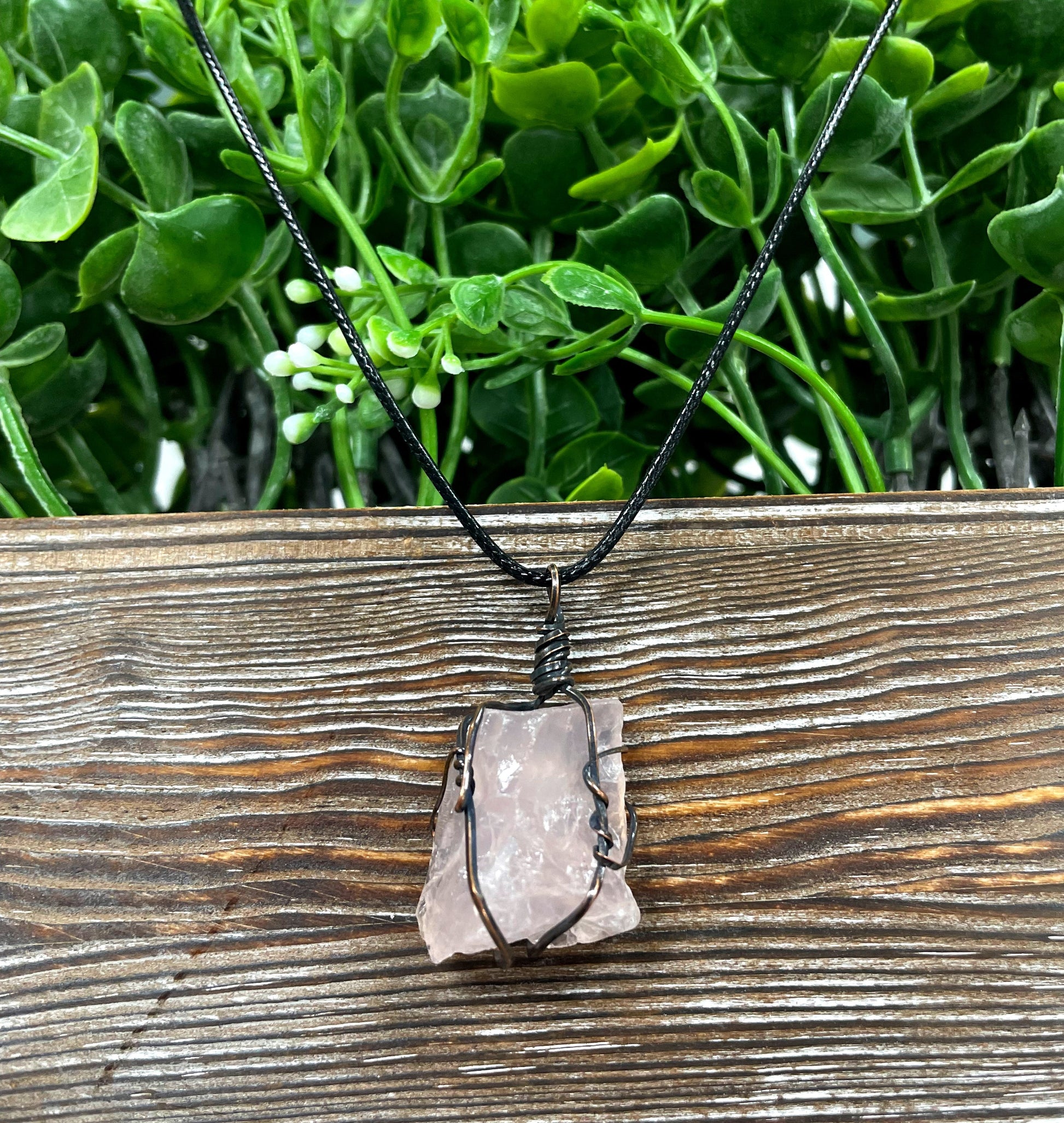 Discover the beauty of natural elegance with our Wire Wrapped Rough Rose Quartz Pendant. This unique piece showcases a stunning rough rose quartz gemstone, expertly wrapped in oxidized copper wire, creating a striking contrast that enhances its raw beauty. The pendant hangs from a 21-inch cord, offering versatility in styling.